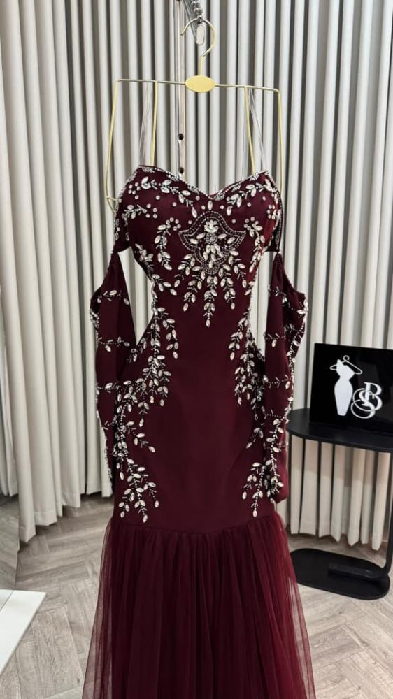 - اللون العنابي الفاخر يضيف لمسة ملكية نادرة ويجعل الفستان مناسباً لكل أجواء السهرات الفخمة.